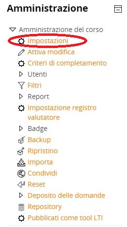Dal menu di amministrazione del corso, cliccando sulla sezione impostazioni, si accede alla sezione di impostazioni corso.